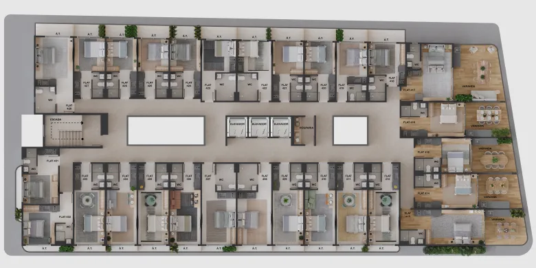 O HIT oferece 139 flats no total, distribuídos em Térreo, 1º, 2º, 3º e 4º pavimentos.